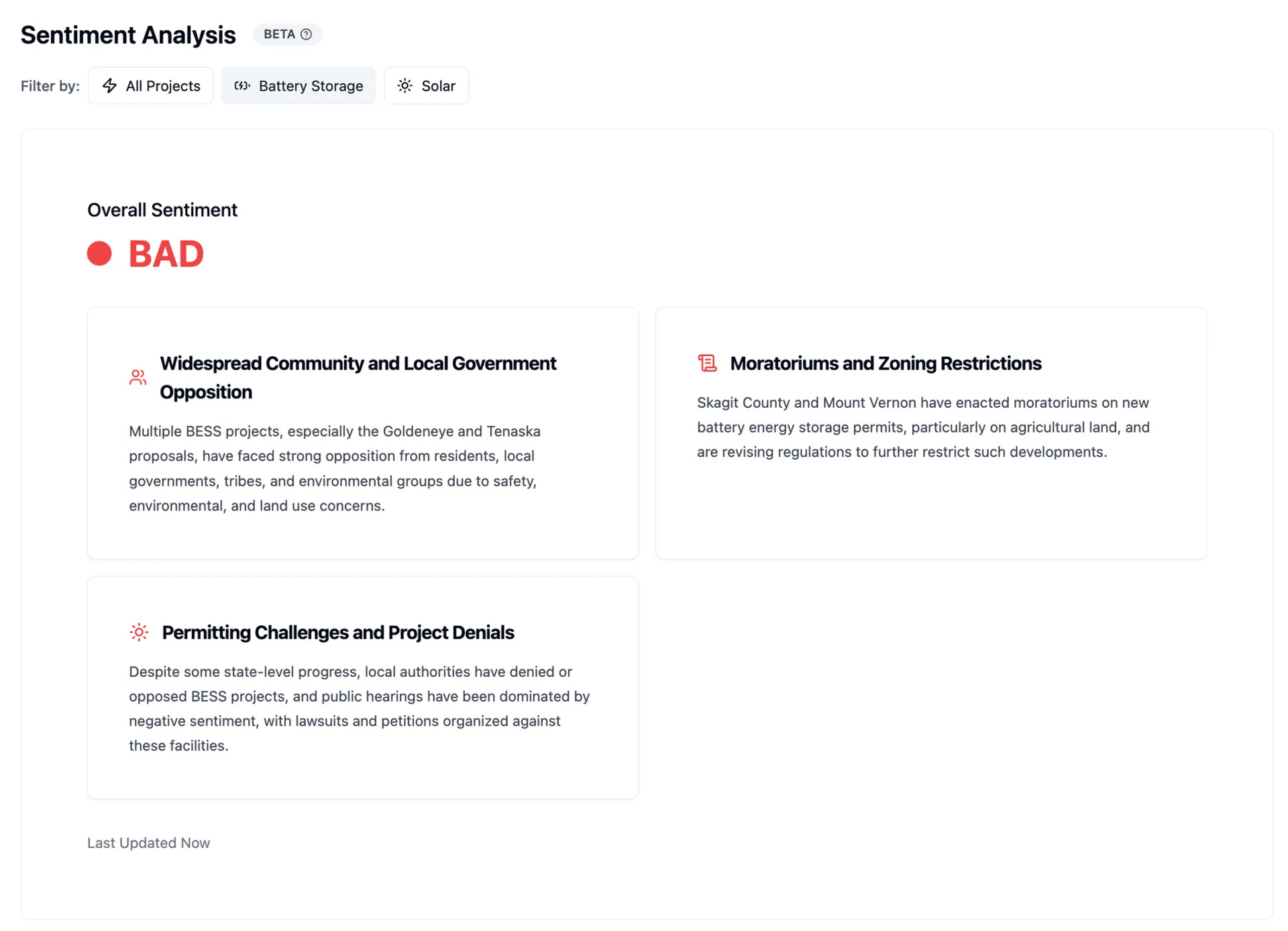 Today, users of Spark can access detailed, AHJ-level analytics on BESS permitting, zoning, and sentiment across every active county in the United States in minutes.